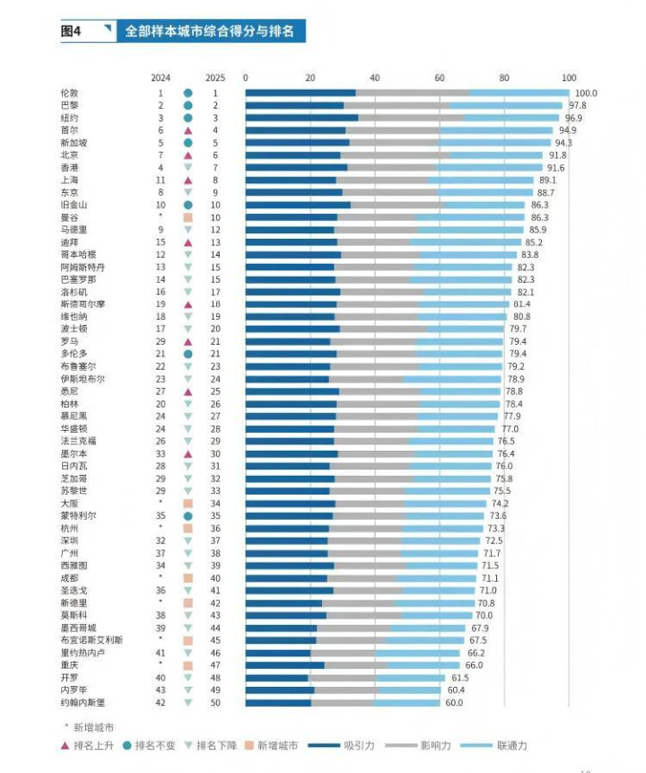 除了北京、香港、上海以外,总榜单中,中国上榜城市还包括:杭州(第36位)、深圳(第37位)、广州(第38位)、成都(第40位)、重庆(第47位)。报告中特别提到,旅游业的强劲复苏对亚洲城市国际吸引力提升有巨大影响。2024年,北京、重庆、杭州、成都等城市的入境外国游客数量同比增长均超过100%。